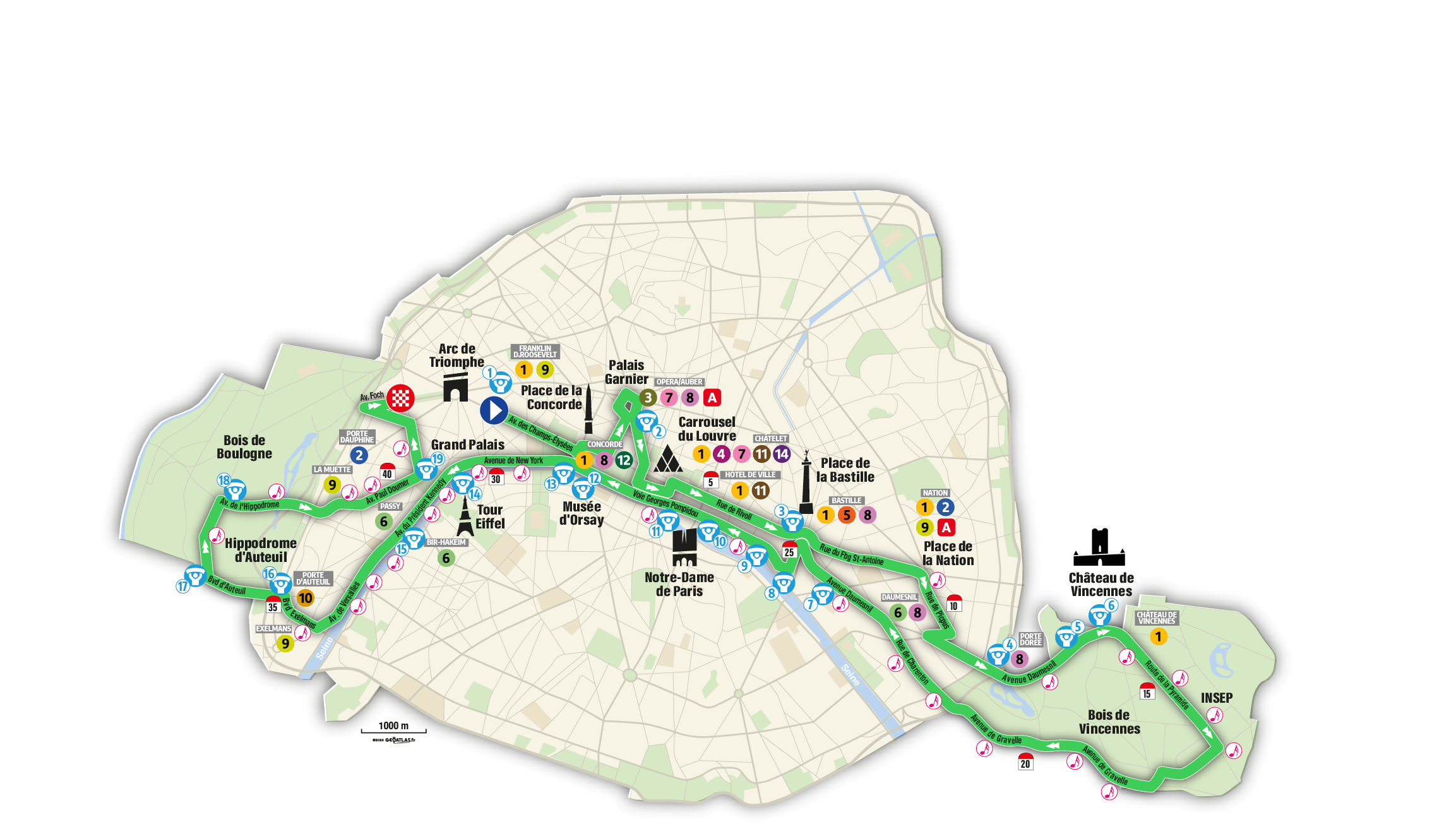 Le temps moyen des marathoniens parisiens étant de 4 h 10, vous aurez le temps de traverser la capitale pour vous rendre dans plusieurs lieux. Et cela tombe bien : 34 stations de métro se trouvent le long du parcours. La RATP a regroupé toutes les informations pertinentes à travers l'initiative « Ligne 42 km ». En savoir plus.