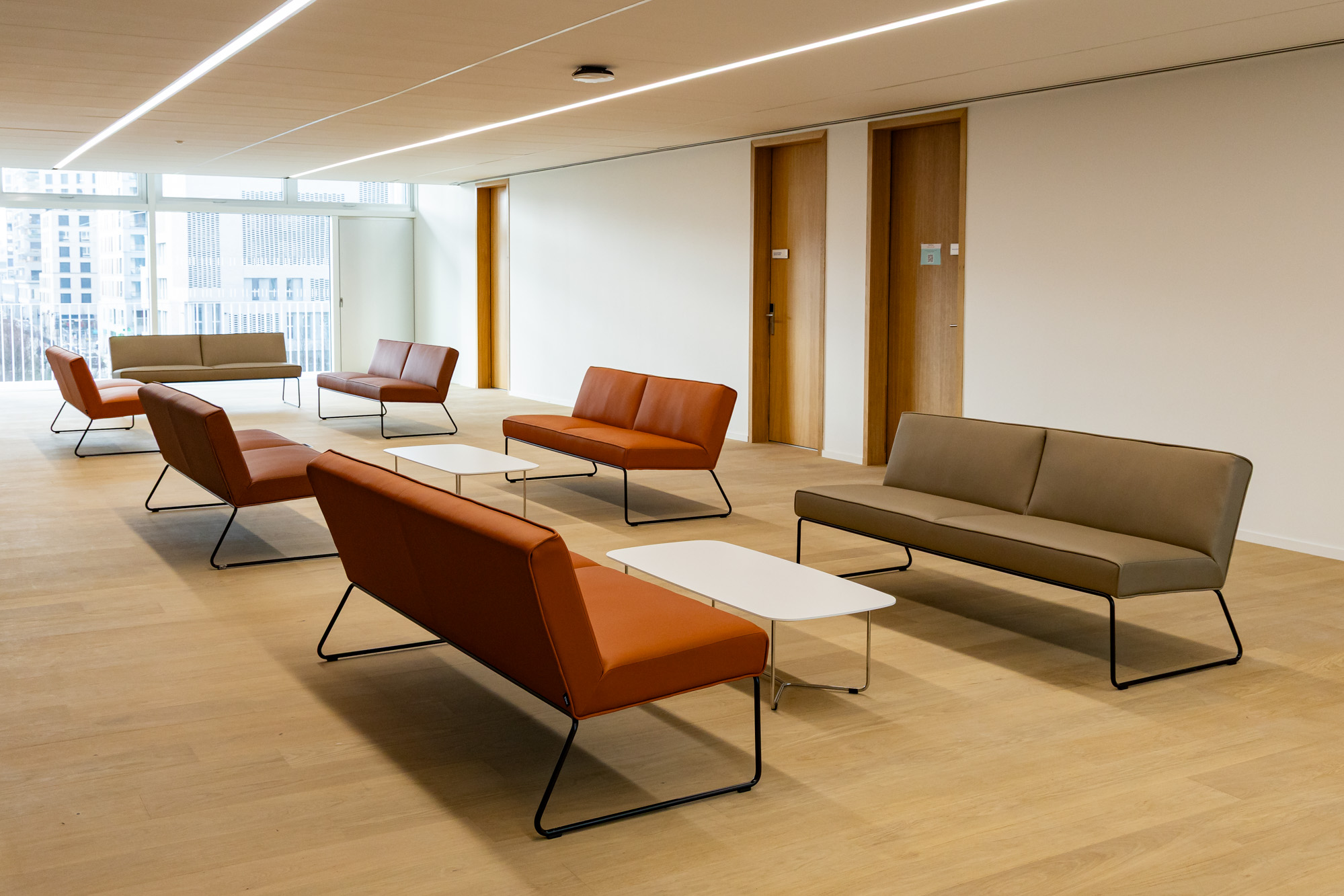 Les revêtements utilisés sont constitués de bois certifiés, de briques de terre cuite et de panneaux acoustiques de haute qualité.