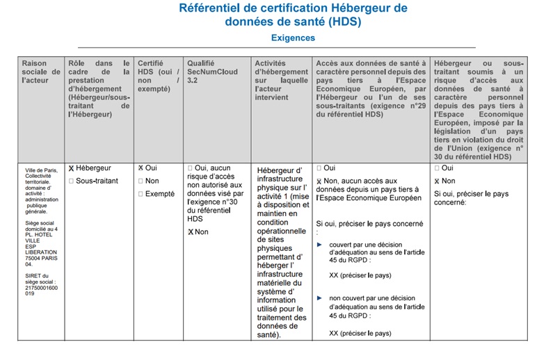 Le périmètre et les acteurs sur lesquels la ville de Paris s’appuie pour délivrer la prestation de service couvert par la certification HDS sont renseignés et cochés dans le tableau suivant :