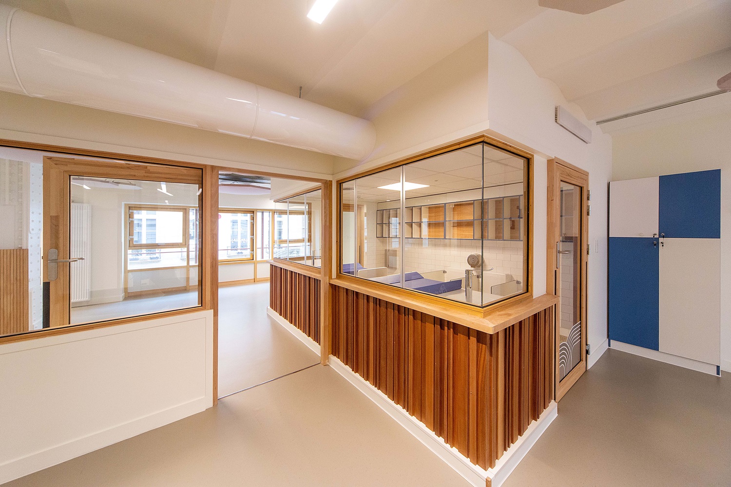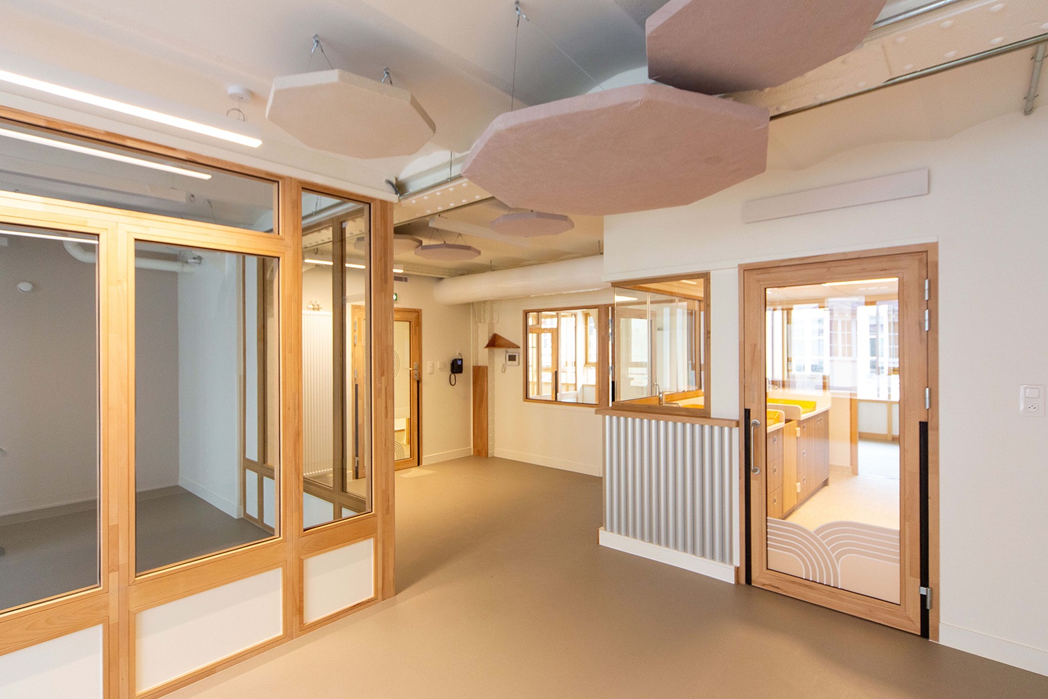 La rénovation de la crèche intègre de nouvelles menuiseries en bois à haute efficacité énergétique.