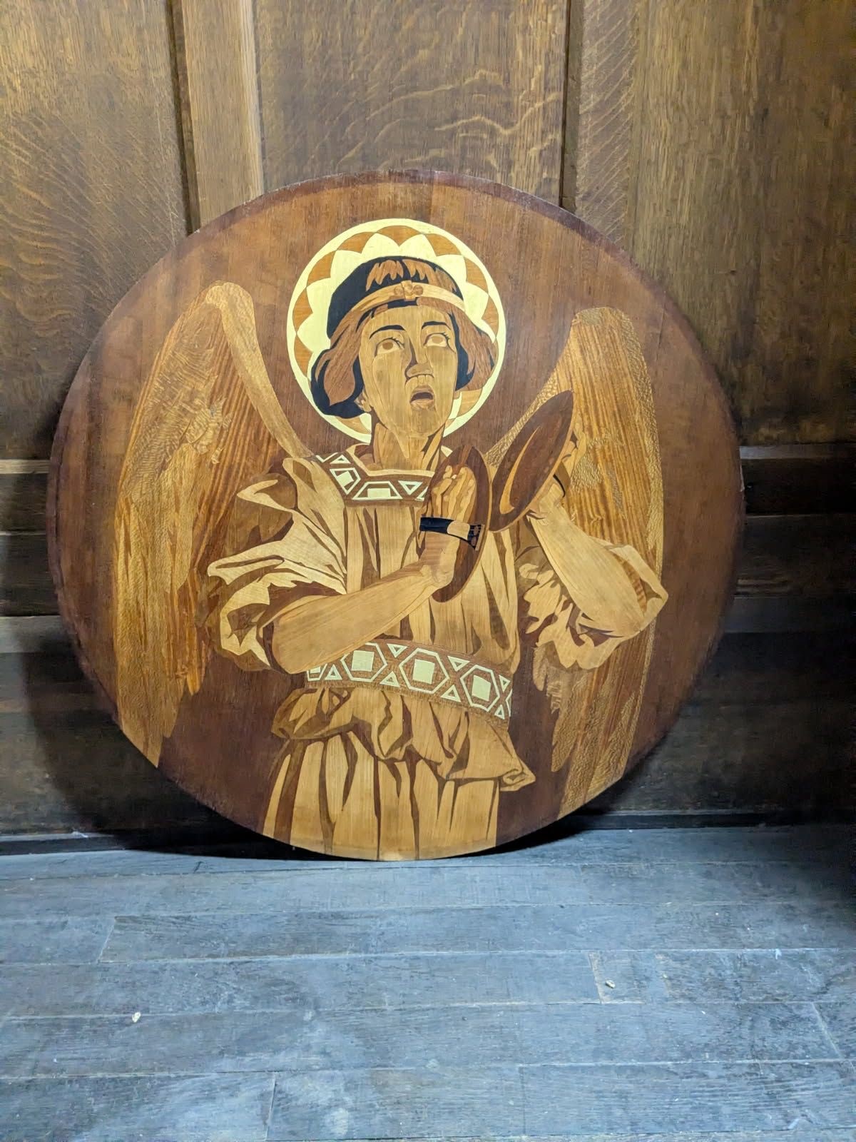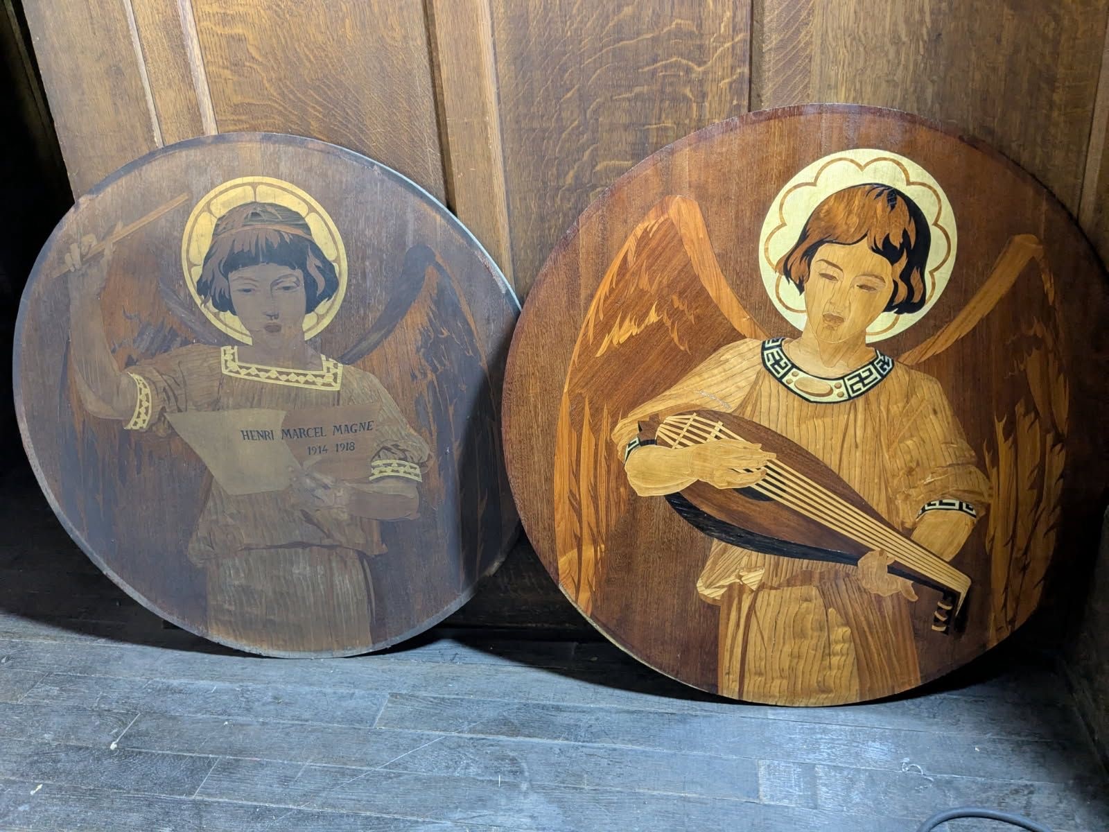 fin de la restauration et la repose des boiseries de la tribune de l'orgue. Ces