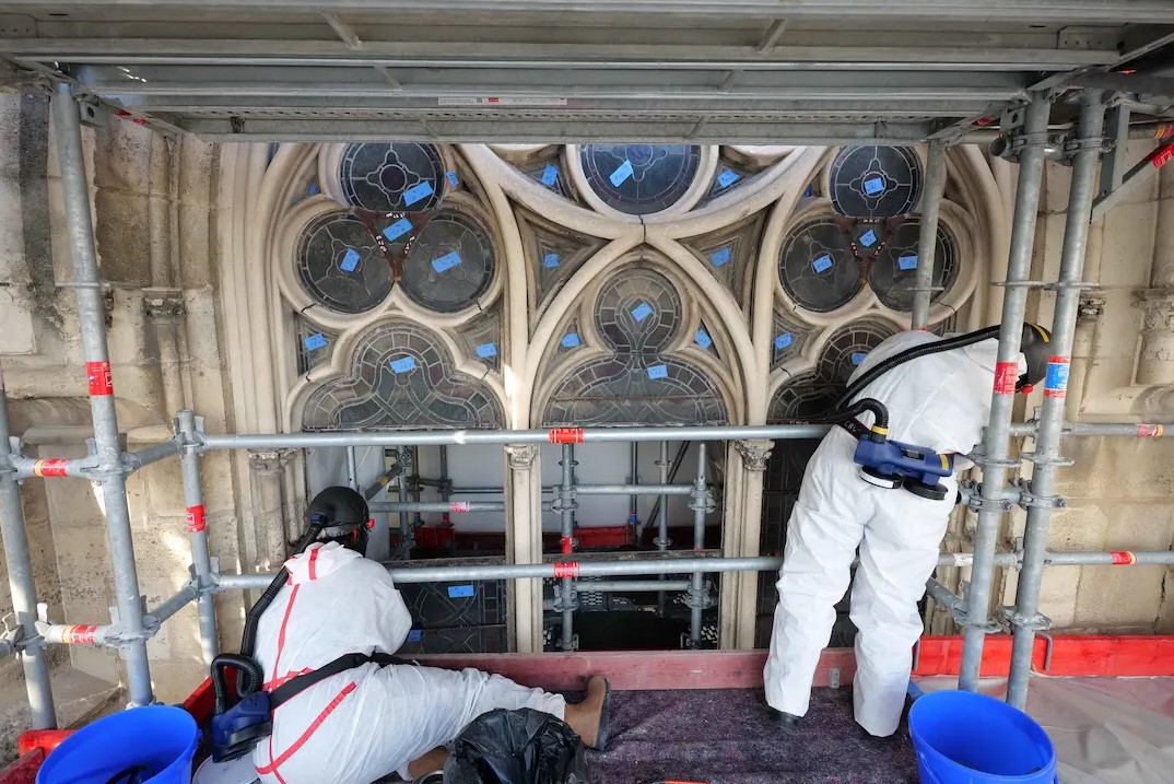 Les vitraux des tribunes du chœur, seulement dépoussiérés après l'incendie, sont déposés avant leur restauration en atelier