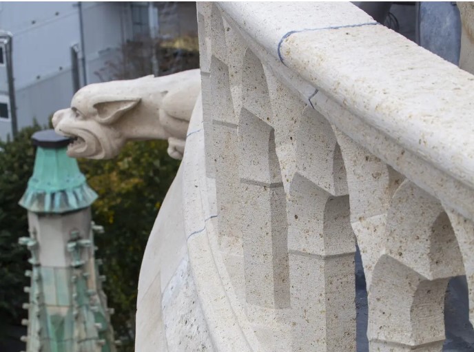 En restauration depuis plusieurs mois, la partie supérieure des murs du chevet est de nouveau visible. Admirez les nombreux éléments restaurés : pierres de taille, gargouilles, garde-corps, sculptures…