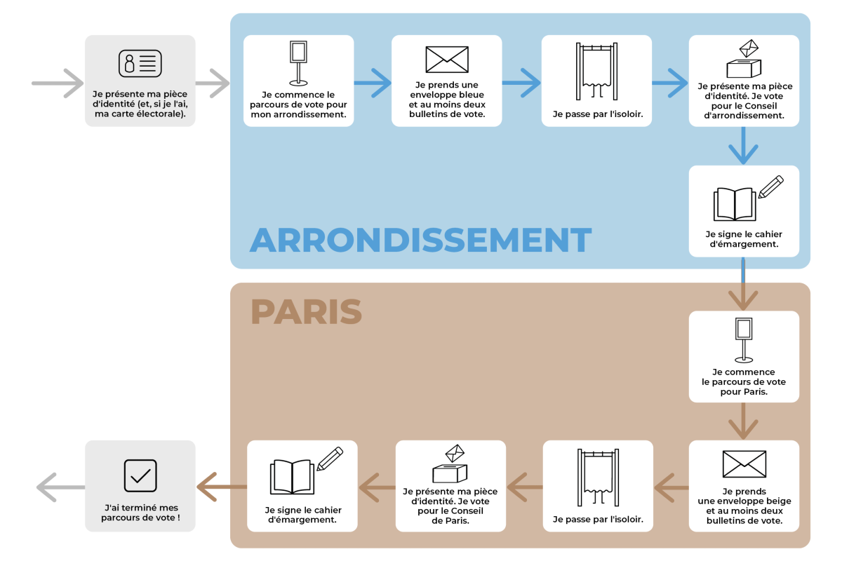 ATTENTION ! Il s’agit de deux votes distincts et successifs qui impliquent deux « parcours de vote ». Pour chacun, l’électeur devra suivre toutes les étapes habituelles : le contrôle de son rattachement au bureau de vote, la remise d’une enveloppe de scrutin (bleue pour l'élection des conseillers d’arrondissement, beige pour l'élection des conseillers de Paris) et la prise des bulletins de vote, le passage dans l’isoloir, le vote à l’urne, puis la signature du cahier d’émargement.