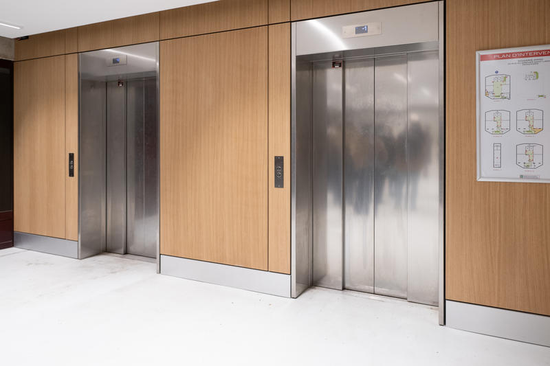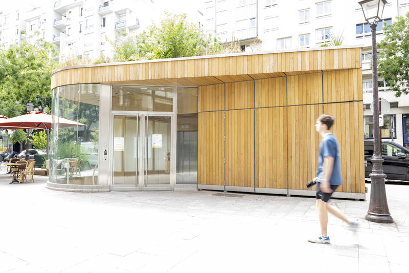 Le petit bâtiment abrite un escalier et un ascenseur reliant le niveau de la rue à celui du Périphérique pour permettre l’accès au un comptoir maraîcher.
