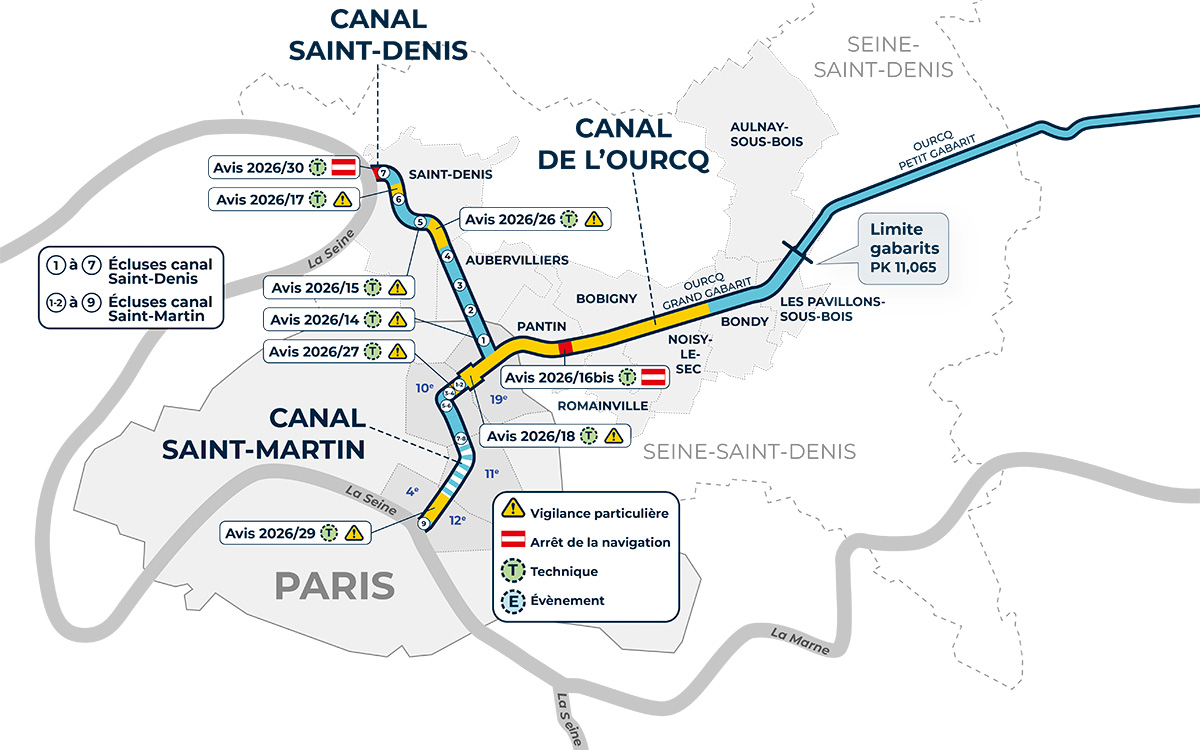 Les usagers du canal de l'Ourcq à grand gabarit sont informés de l'organisation de travaux de signalétique entre le lundi 23 mars et le vendredi 17 avril 2026.
